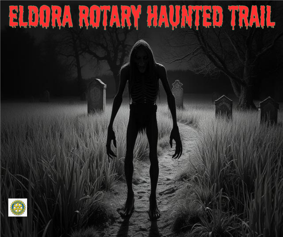 The Eldora Rotary Haunted Trail will take place on October 11, 18, and 25 from 7:30pm-10:30pm and will be located at 1851 24th Street, Eldora IA 50627. General admission is $10/person and are available at https://app.hauntpay.com/ venues/9046. Guests should be prepared for a 20 minute walk down the spookiest trail around!